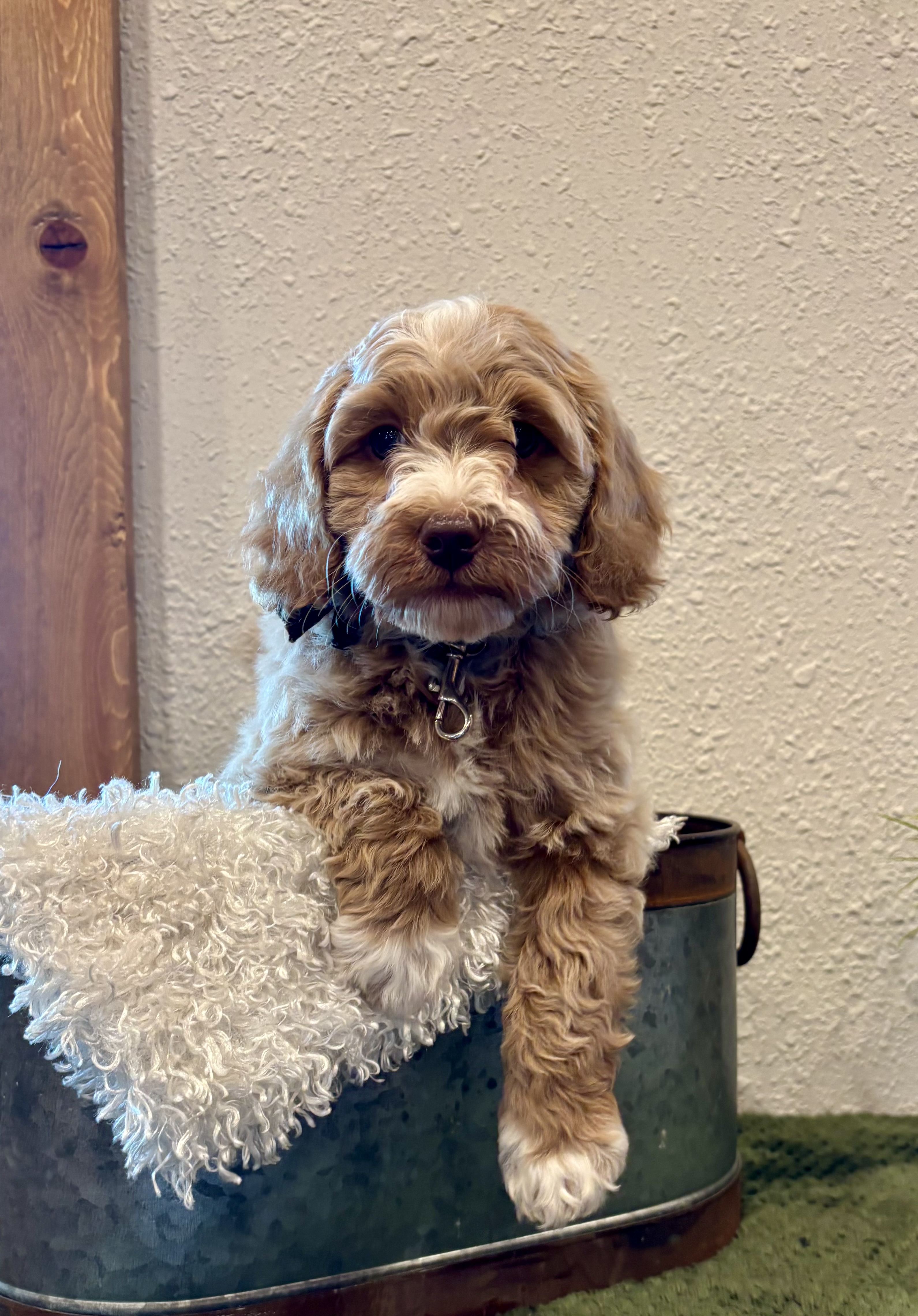 Mini whoodles are the best of all worlds- small enough to cuddle on your lap and big enough to go on every adventure with you! Our mini whoodles average around 15 lbs and they come in a variety of colors which makes every birth an exciting event!!